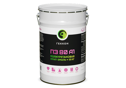 Геккон ПЭ 80 А1 - Двухкомпонентная полиуретановая грунт-эмаль на основе комплекса форполимеров, отверждаемая за счёт влаги атмосферного воздуха, с высоким сухим остатком, защитные свойства которой усилены слюдяным оксидом железа. Материал с низким содержанием растворителя обеспечивает превосходную долговременную антикоррозионную защиту, пригоден для различных поверхностей и может наноситься большой толщиной слоя. Материал может наноситься как в качестве грунта, так и в качестве финишного покрытия.